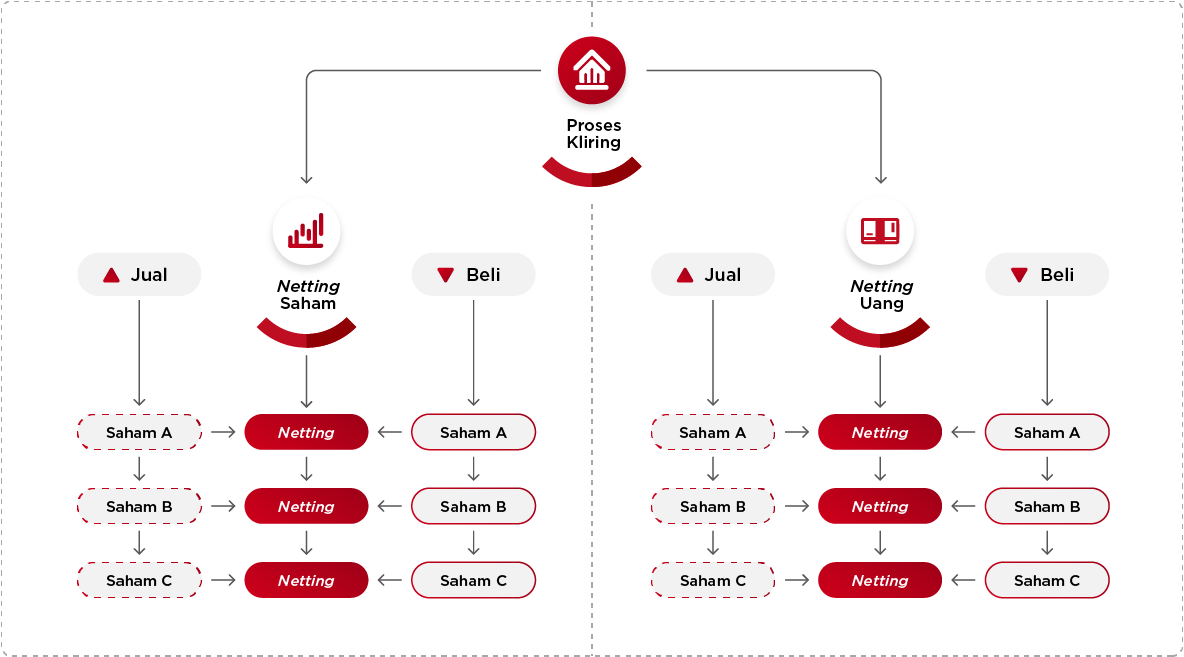 All equity products traded on the Indonesia Stock Exchange (IDX) are cleared by IDClear. The clearing method applied depends on the selected market type. Transactions in the Regular Market and Cash Market use netting, while those in the Negotiated Market employ per-transaction clearing.