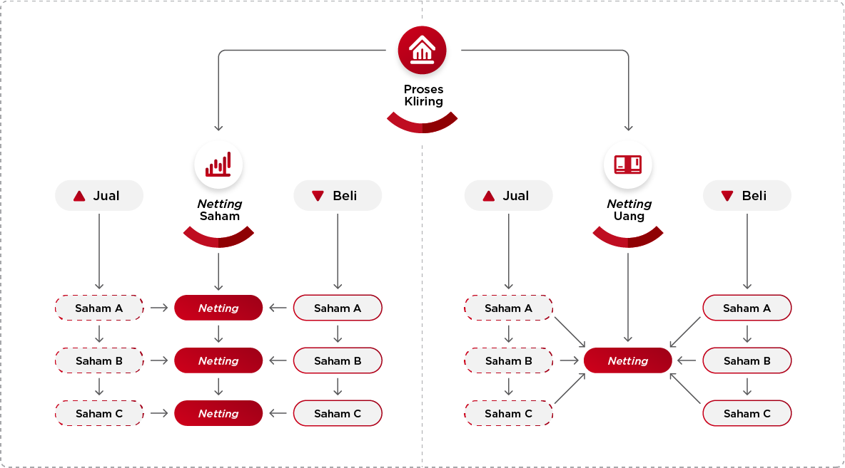 Kliring Secara NettingKliring secara netting mengkompensasikan seluruh transaksi jual beli efek Anggota Kliring (AK) sehingga pada tanggal penyelesaian setiap AK hanya memiliki satu posisi serah atau terima dana dan satu posisi serah atau terima per jenis efek.